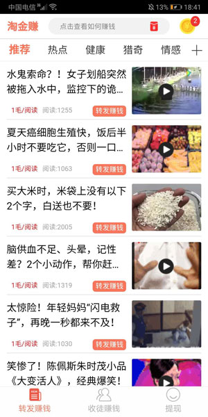 淘金赚是有银子旗下最新转发文章赚钱平台,注册送1元,1元就能提现。转文章,赚零花,分享新闻享广告收益,每篇文章0.1元/每阅读 ,收徒享受二级共30%提成。